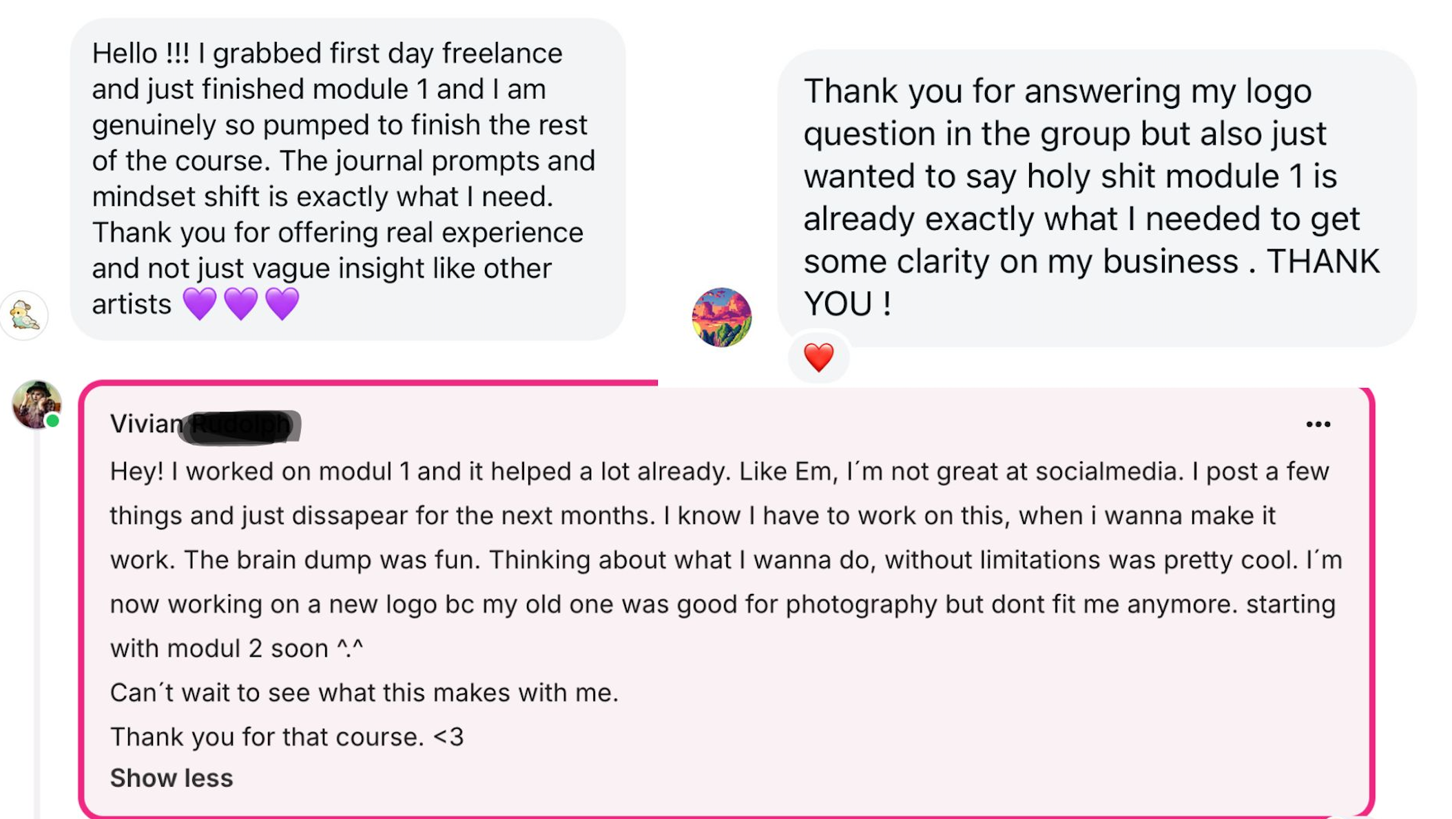 When you enroll, you also get exclusive access to a private community of like-minded, goal-oriented creatives where I personally answer questions and give targeted feedback.